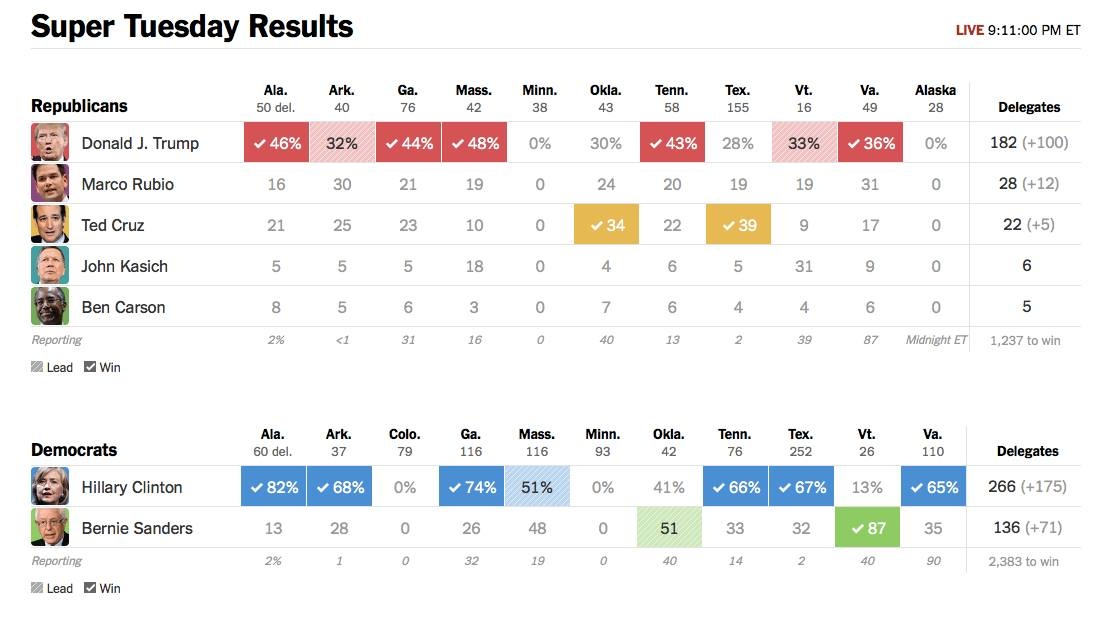 Kết quả cập nhật bầu cử sơ bộ ngày Siêu thứ ba tính đến 9h ngày 2/3 (giờ Hà Nội). Ảnh: NYT |