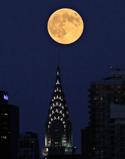 Trăng tròn phía sau tòa nhà Chrysler ở thành phố New York, Mỹ. Ảnh: Telegraph |