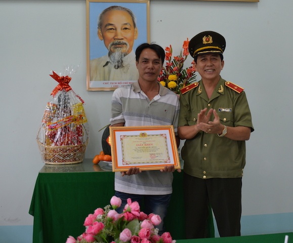 | Giám đốc Công an tỉnh Đồng Tháp trao giấy khen cho người dân. |