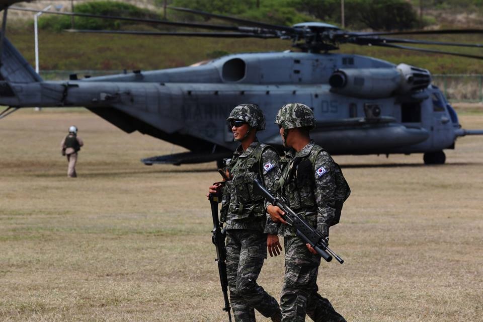 Binh sĩ Hàn Quốc tập hợp sau khi trải qua bài tập trượt xuống từ trực thăng CH-53E Super Stallion trong khuôn khổ cuộc Tập trận phối hợp trên không và mặt đất (GAIT). GAIT cho phép các lực lượng vũ trang nhanh chóng chiếm đóng những vị trí quan trọng mà máy bay không cần hạ cánh.