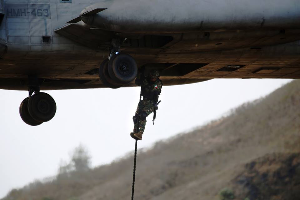 Binh sĩ lực lượng bộ binh của Hải quân Mexico tiếp đất bằng dây thừng.
