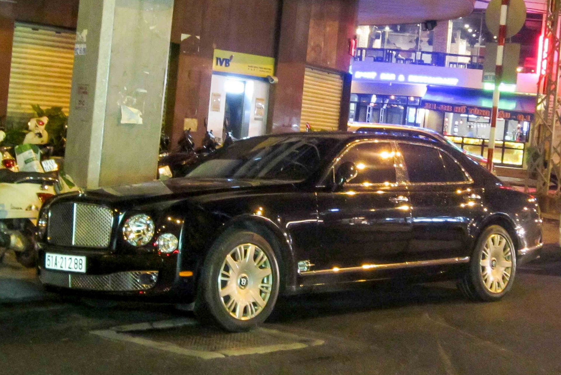 | Ngoài siêu xe và xe thể thao, buổi tụ họp còn có sự xuất hiện của mẫu xe siêu sang Anh quốc Bentley Mulsanne màu đen. Mulsanne là đối thủ duy nhất còn lại của Rolls-Royce Phantom. Bản tiêu chuẩn của mẫu xe siêu sang này có giá trên 300.000 USD tại Mỹ và trên 1 triệu USD tại Việt Nam. |