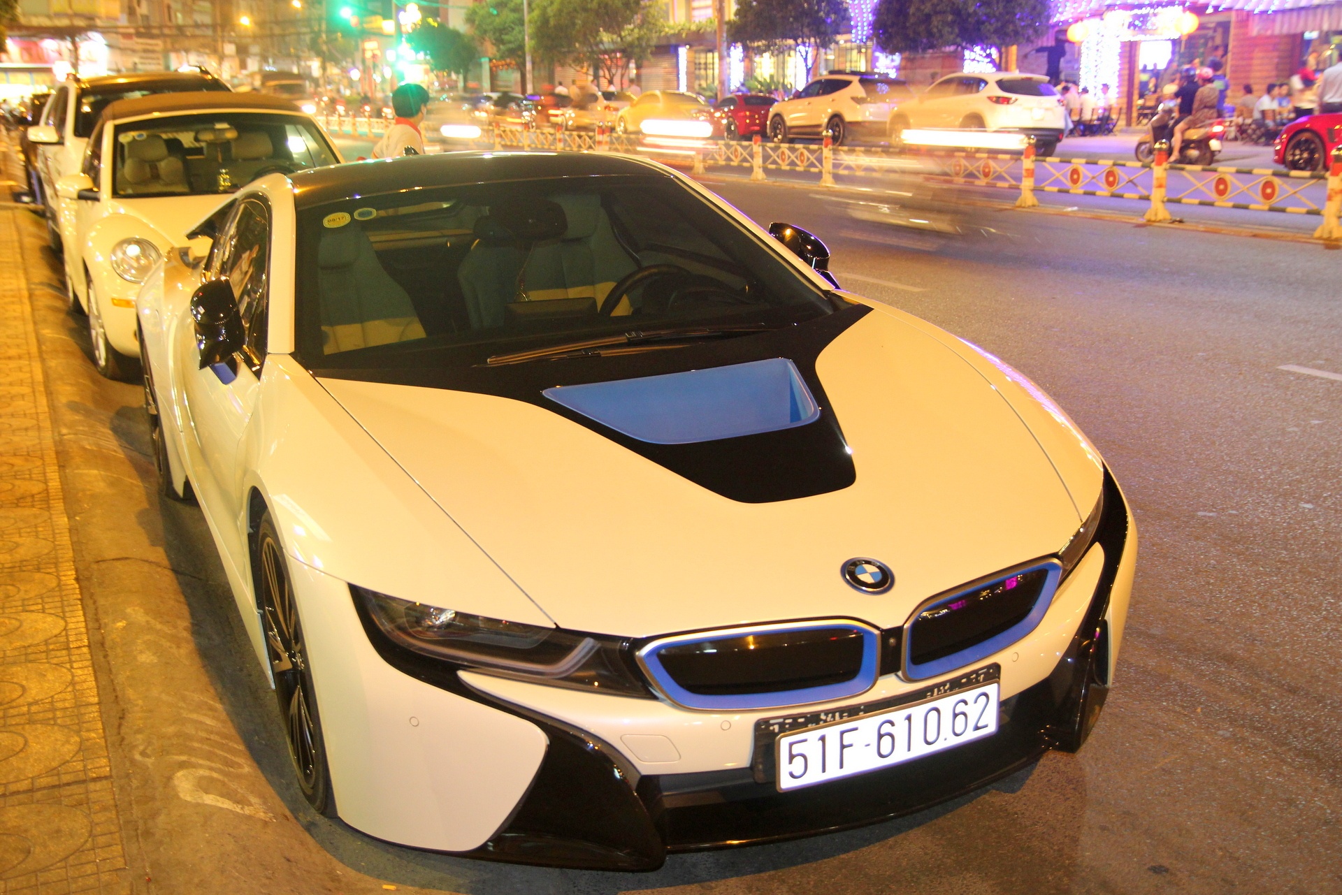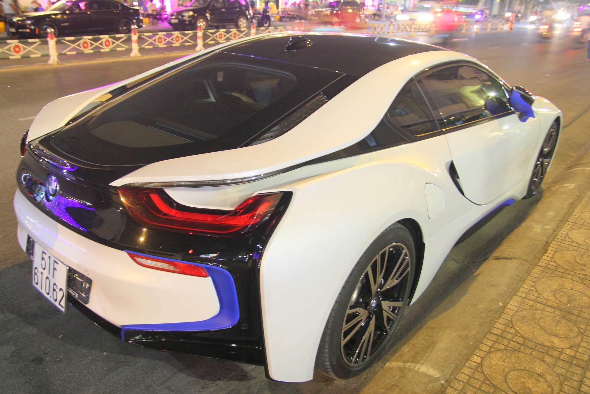 | Đáng chú ý nhất phải kể đến chiếc BMW i8 màu trắng. Mẫu xe này đã được chủ nhân độ thêm vài chi tiết ngoại thất. Các viền xanh tương phản với thân xe khá hài hòa, bắt mắt. |