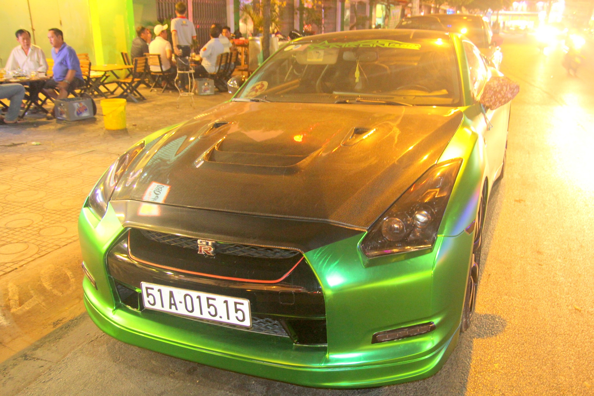 | Chiếc Nissan GT-R được độ lại nắp carbon và dán decal chrome xanh. Xe được gắn ống xả hiệu Kreissieg của Nhật Bản, cánh gió sợi carbon. Bên dưới nắp ca-pô là khối động cơ V6 tăng áp, dung tích 3,8 lít, công suất 478 mã lực và 588 Nm mô-men xoắn. |