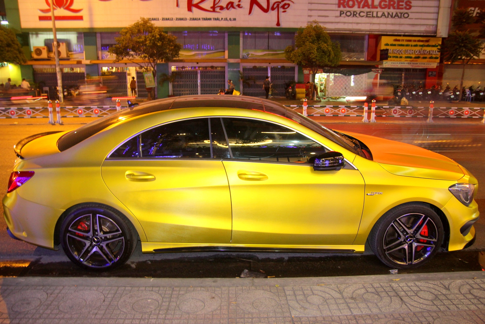 | Mercedes CLA 45 AMG được dán decal màu vàng nhám nổi bật trong đêm. Tại Việt Nam, CLA 45 có giá khoảng 2,2 tỷ đồng. |