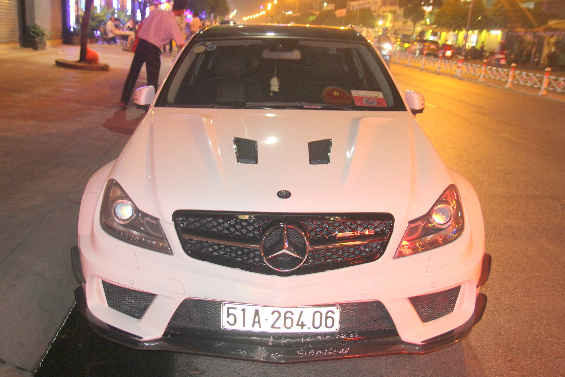 Đây là chiếc Mercedes C-Class đời 2012. Chủ xe đã gắn thêm gói độ thân rộng theo phong cách Black Series khá hầm hố. Các cánh gió, líp cản trước bằng sợi carbon. Nắp ca-pô cũng được dập nổi.