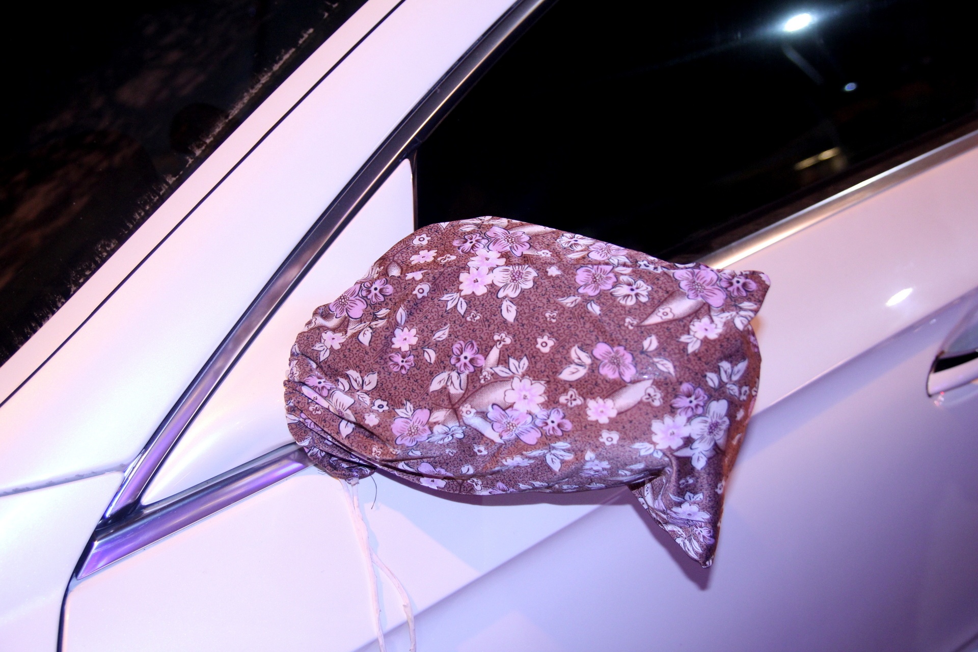 | Những chiếc xe sang đỗ bên đường được bọc gương bằng túi vải để chống nạn bẻ trộm gương. |