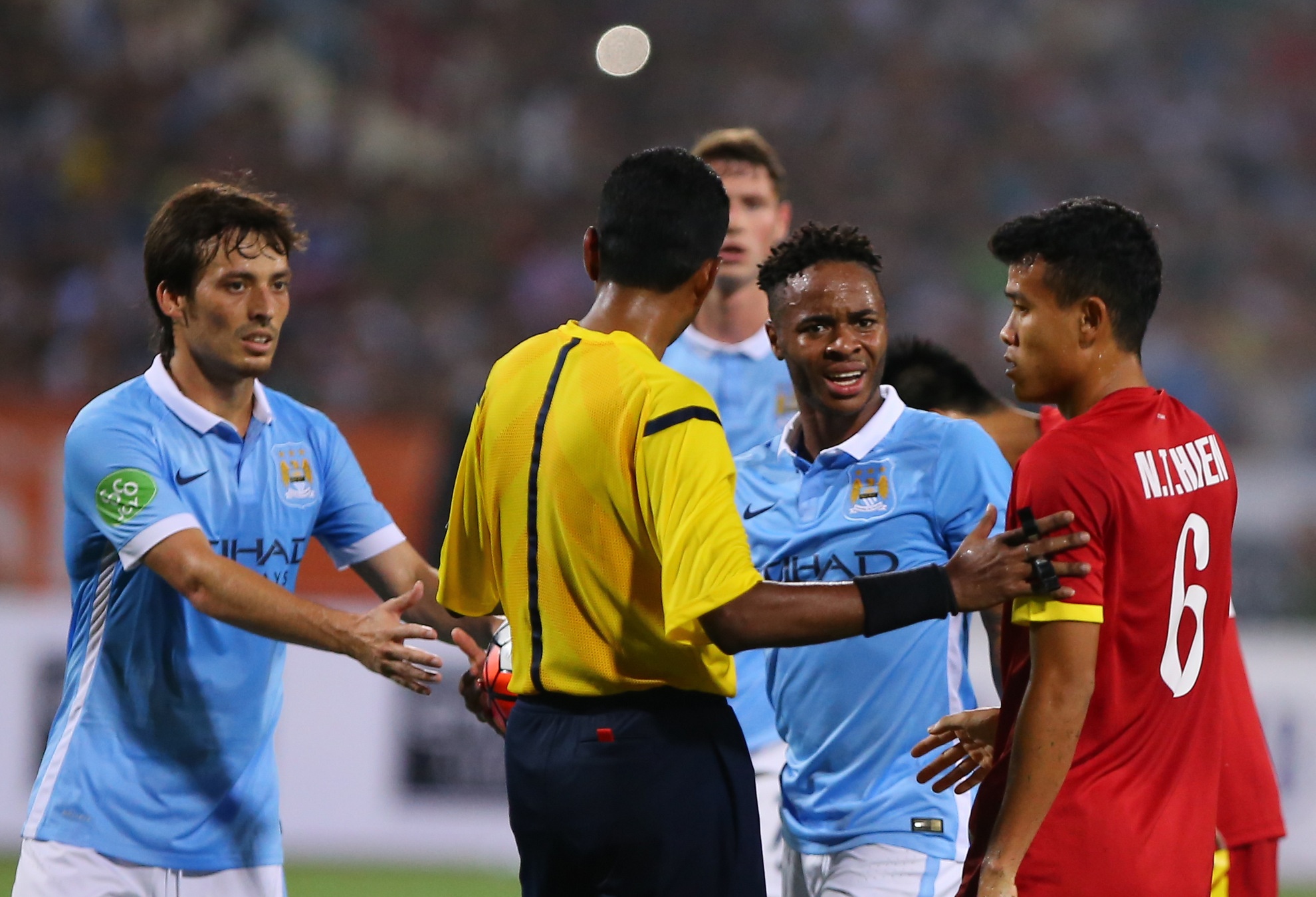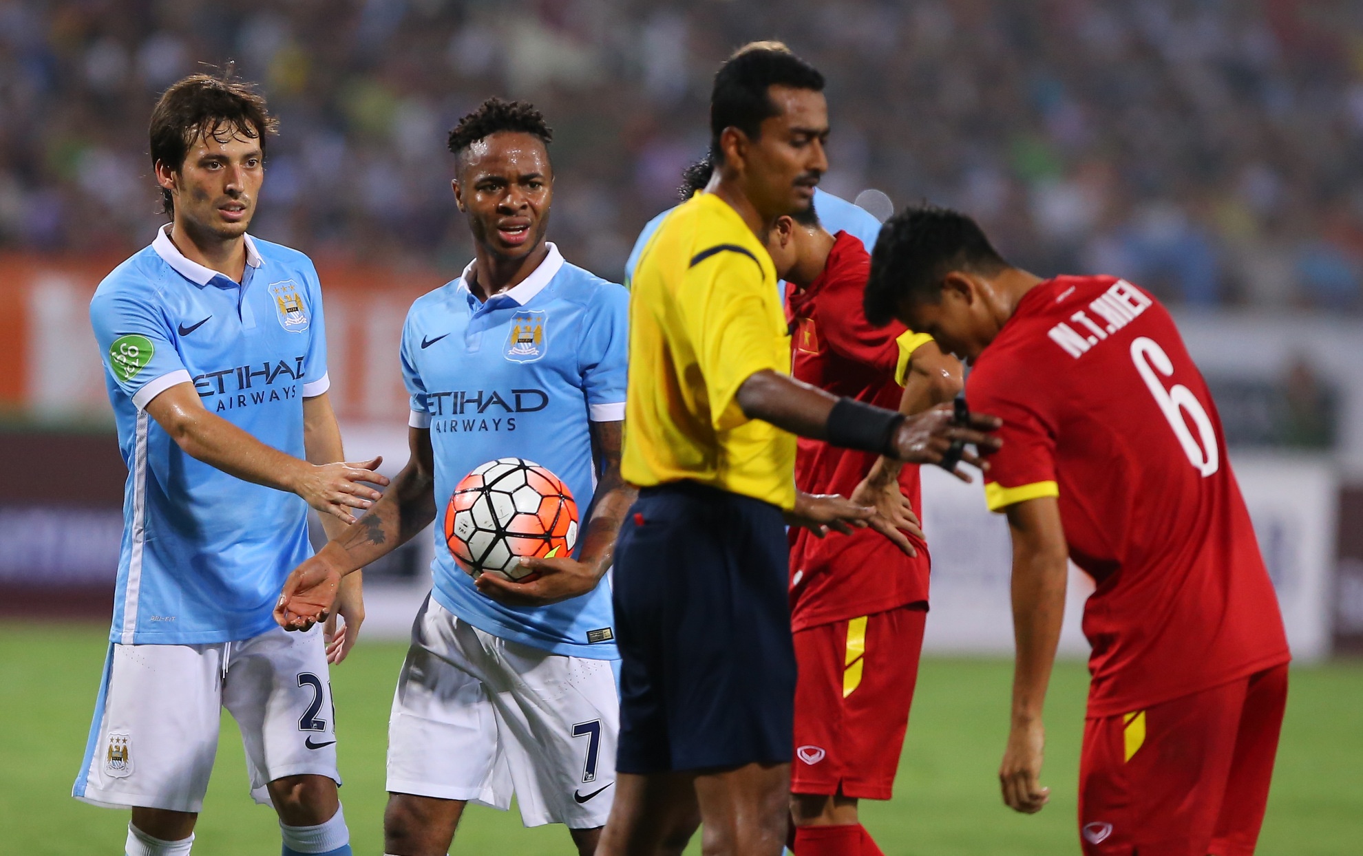 | Tình huống truy cản của Thanh Hiền khiến tân binh Man City phản ứng dữ dội. Sterling cho rằng hậu vệ ĐT Việt Nam cố tình phạm lỗi với anh. Đàn anh David Silva phải chạy tới ngăn Sterling lao vào phản ứng với trọng tài vì không rút thẻ phạt cảnh cáo Thanh Hiền. |