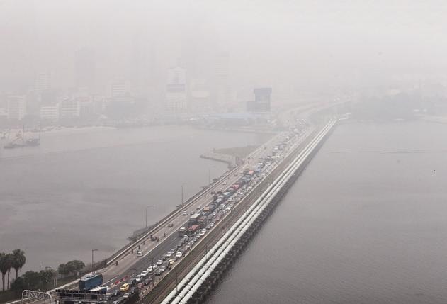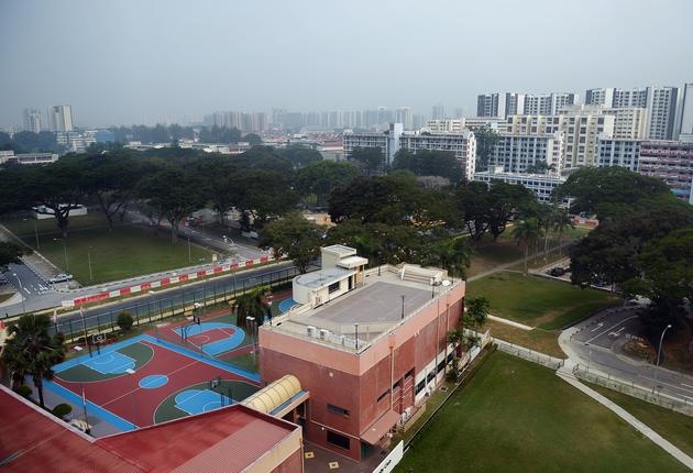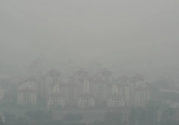 Bầu trời quang đãng xung quanh khu liên hợp thể thao Sports Hub hồi tháng 5/2014 (trái) và cảnh khói mù bao trùm khu vực này lúc 9h30 hôm 5/10. Chỉ số ô nhiễm không khí (PSI) đo được tại đây trong 3 tiếng là 142 – vượt quá mức 100. |