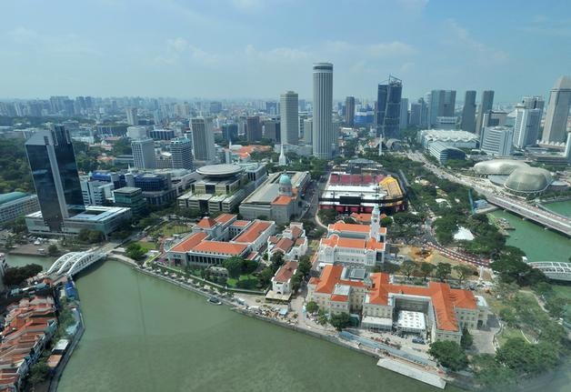 Khu vực xung quanh trung tâm Rochor quang đãng trong bức ảnh không rõ ngày (trái) và bầu không khí dày đặc khói được chụp lúc 9h30 ngày 5/10 khi chỉ số PSI là 142. |