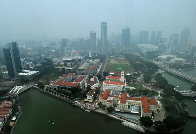 Không khí trong lành quanh các tòa nhà chọc trời ở khu trung tâm thương mại CBD hồi tháng 7 (trái) và cảnh mây mù do khói tràn sang từ Indonesia lúc 13h30 ngày 1/10. Chỉ số PSI đo trong 3 giờ hôm đó ghi nhận ở mức 182. |