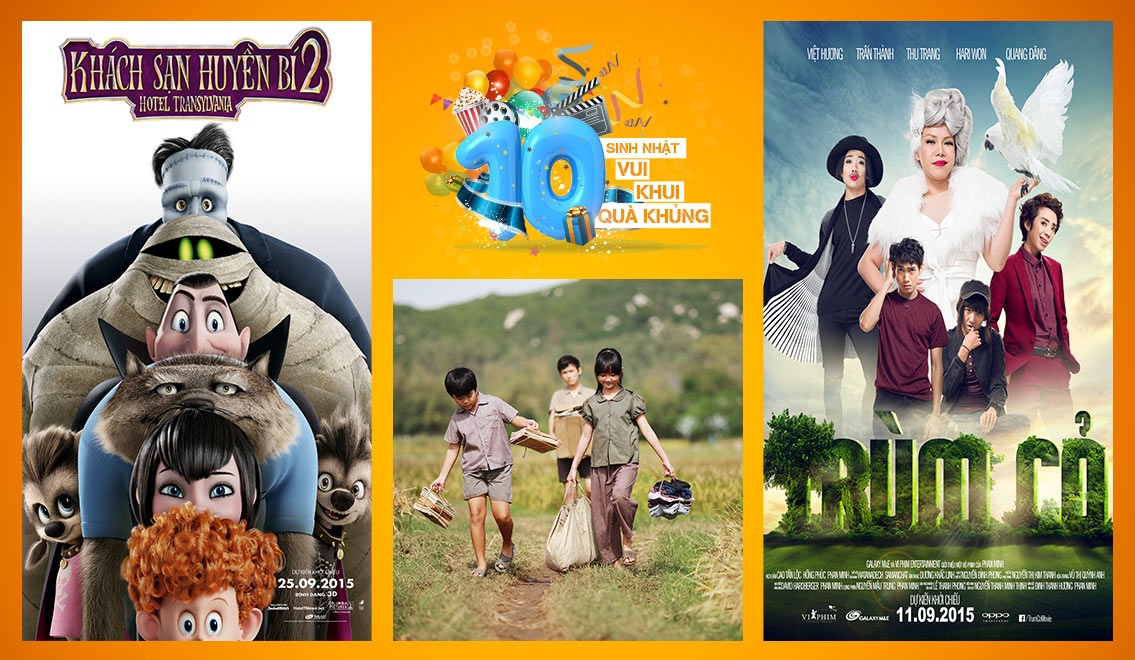 Chương trình mừng sinh nhật Galaxy sẽ diễn ra vào khoảng thời gian đổ bộ của những bom tấn chất lượng hàng đầu Hollywood và Việt Nam, mở màn cho mùa phim gia đình cuối năm. Đó là The Maze Runner 2 (Giải mã mê cùng 2) - hiện tượng phim phiêu lưu tuổi thiếu niên, phần tiếp bộ phim hoạt hình gia đình hài hước ăn khách Hotel Transyvalnia 2 (Khách sạn Transyvalnia 2) và đặc biệt phim Việt được chờ đợi nhất trong năm Tôi thấy hoa vàng trên cỏ xanh của đạo diễn Victor Vũ...
