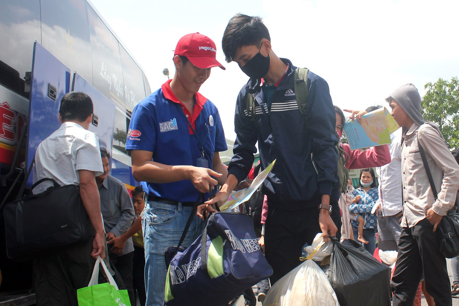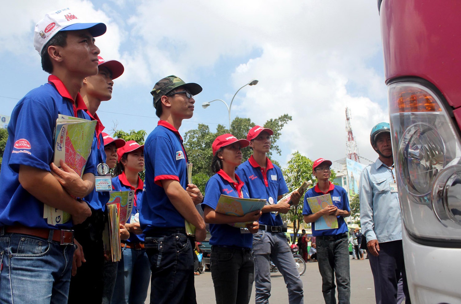 | Khi thí sinh bước xuống xe, các sinh viên tình nguyện sẽ tiếp cận và hỏi các thông tin thí sinh cần giúp đỡ như đi lại, địa điểm thi, chỗ trọ, vé xe buýt... Hầu hết thí sinh và người thân đều được các bạn phát bản đồ và hướng dẫn chi tiết đia điểm thi trước khi rời bến xe. |