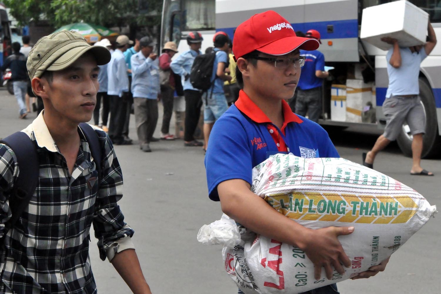 | Các bạn nam xách, bê đồ cho các thí sinh. |