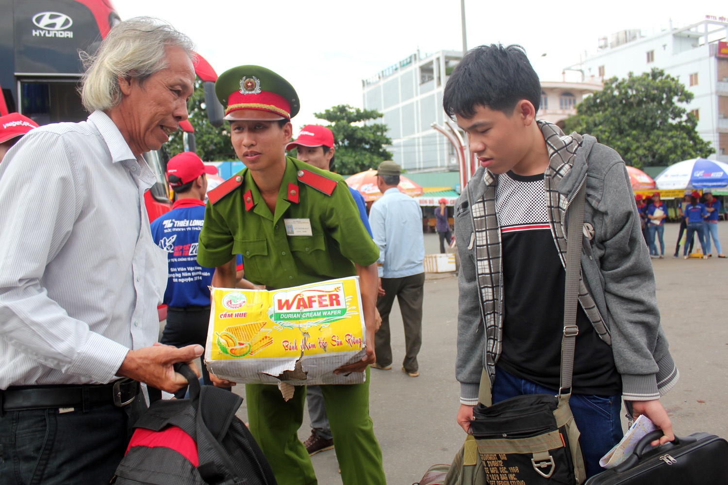 | Một chiến sĩ công an túc trực bảo vệ trật tự cho các thí sinh tại bến xe Miền Đông giúp đỡ thí sinh và người nhà mang đồ ra khỏi bến. Bạn Nguyễn Thế Tiếng, đội trưởng đội SVTN Bến xe Miền Đông cho biết, vào những ngày cao điểm này, mỗi ngày đội tiếp sức, giúp đỡ cho hàng ngàn thí sinh. |