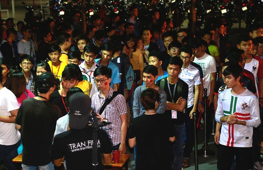| Có mặt từ sớm trước khi sự kiện bắt đầu, hơn 2.000 sinh viên ĐH Tôn Đức Thắng xếp hàng check-in để được vào bên trong nhà thi đấu. Đây là nơi sẽ diễn ra sự kiện Cùng bóng đá khám phá Euro phục vụ nhu cầu thưởng thức trận chung kết đêm khuya cho các bạn trẻ. |