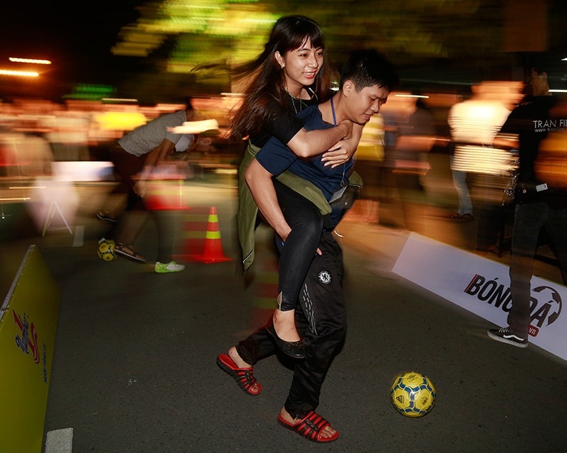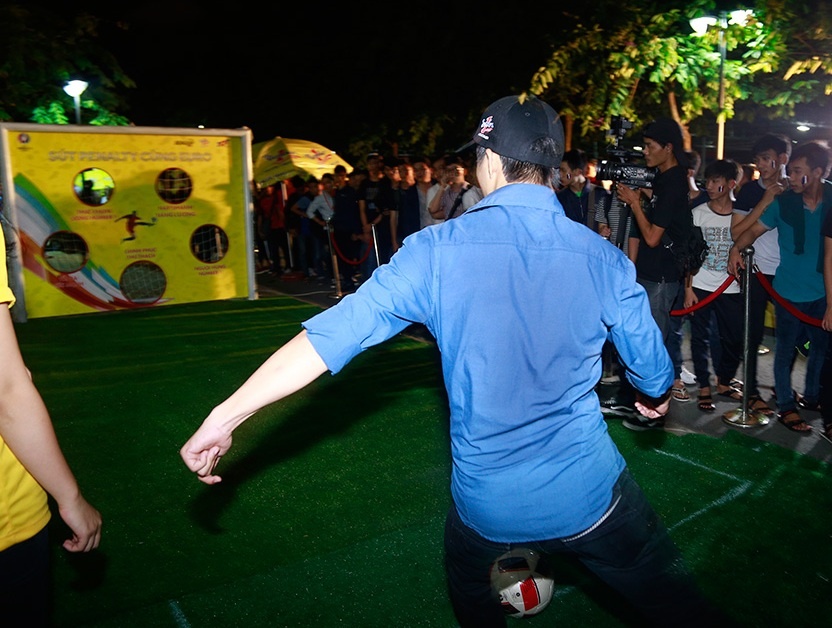 | Nếu ngại xếp hàng nhưng sẵn sàng có sức thì những trò chơi ngay sảnh nhà thi đấu sẽ giúp sinh viên lấy được “giấy thông hành” vào bên trong sớm hơn. Tuy nhiên, thử thách của chương trình không dễ, buộc bất kỳ người chơi nào cũng phải khéo léo mới giành được chiến thắng. Sút bóng vào vòng tròn có lẽ là trò làm nản lòng nhiều bạn sinh viên nhất. Đã có không ít bạn nam sẵn sàng xếp hàng nhiều lượt chỉ để chinh phục được thử thách này trước khi bước vào xem trận chung kết Euro. |