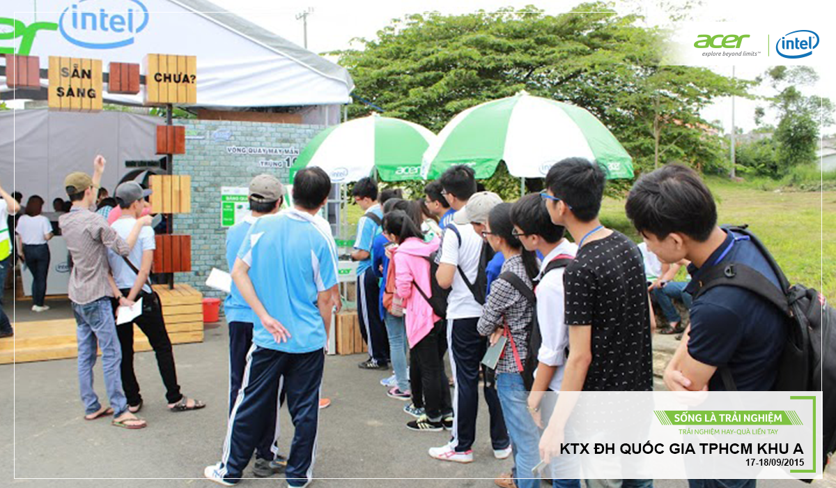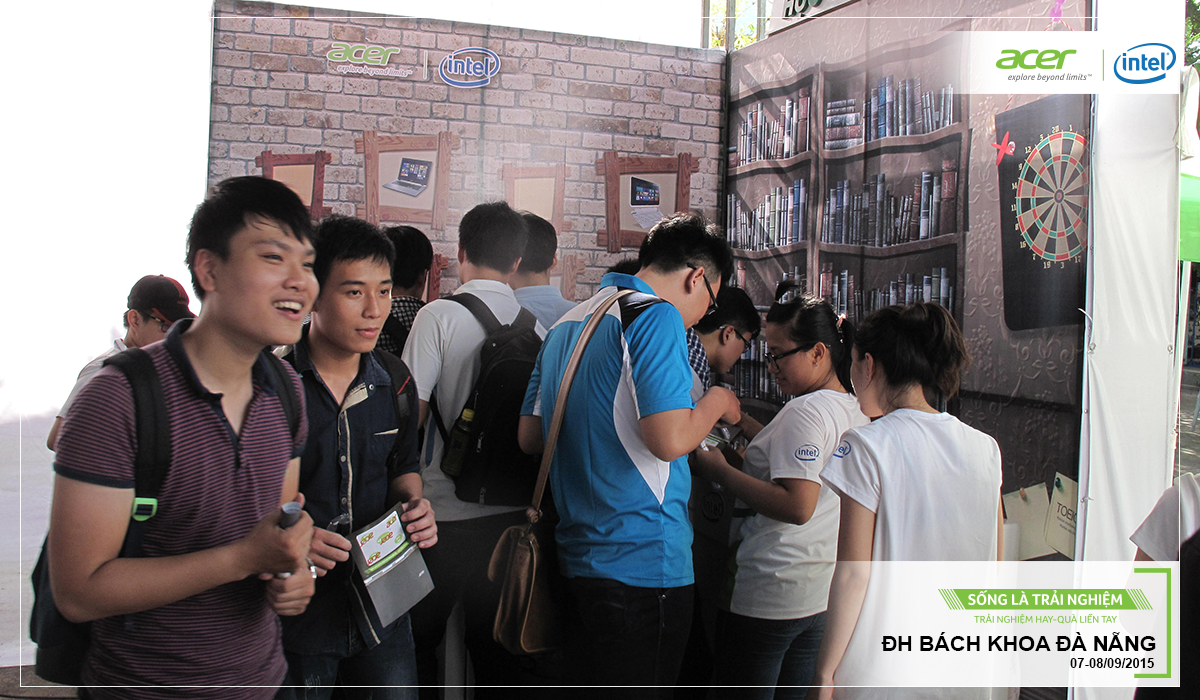 Các bạn sinh viên tham gia và trải nghiệm sản phẩm tại các gian hàng gồm học đâu có khó, quẩy lên nào, du lịch kiểu mới cùng Acer, ngại gì nói lời yêu.