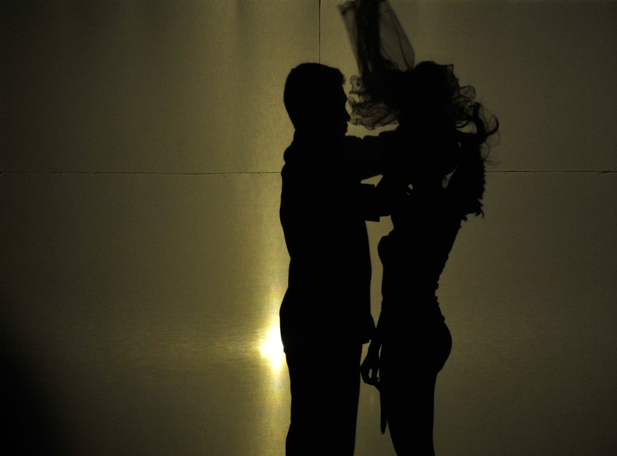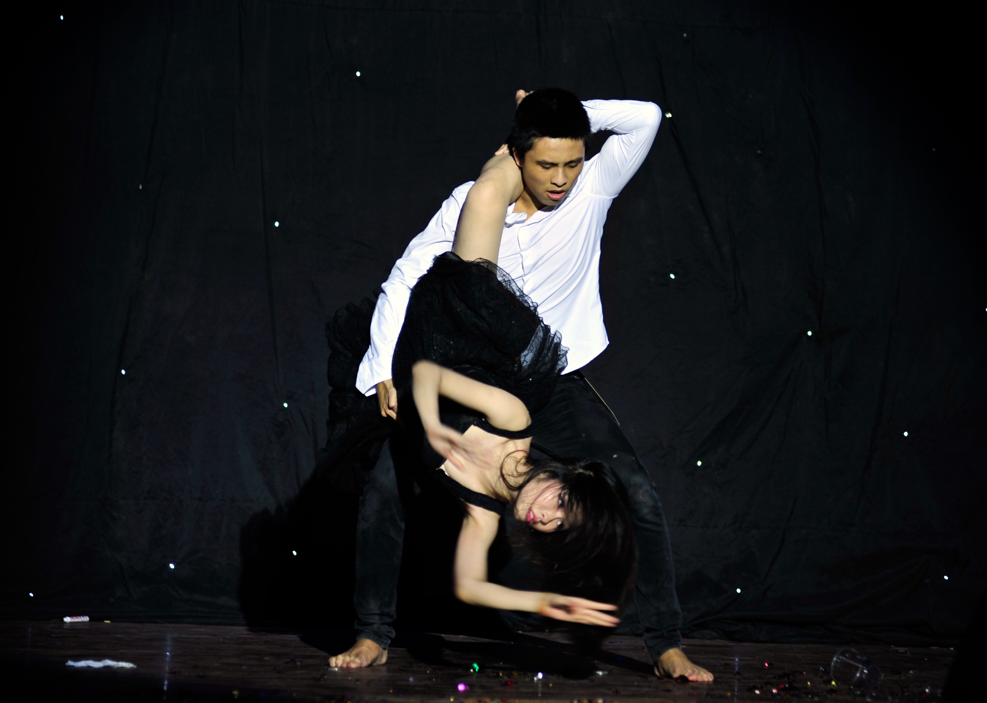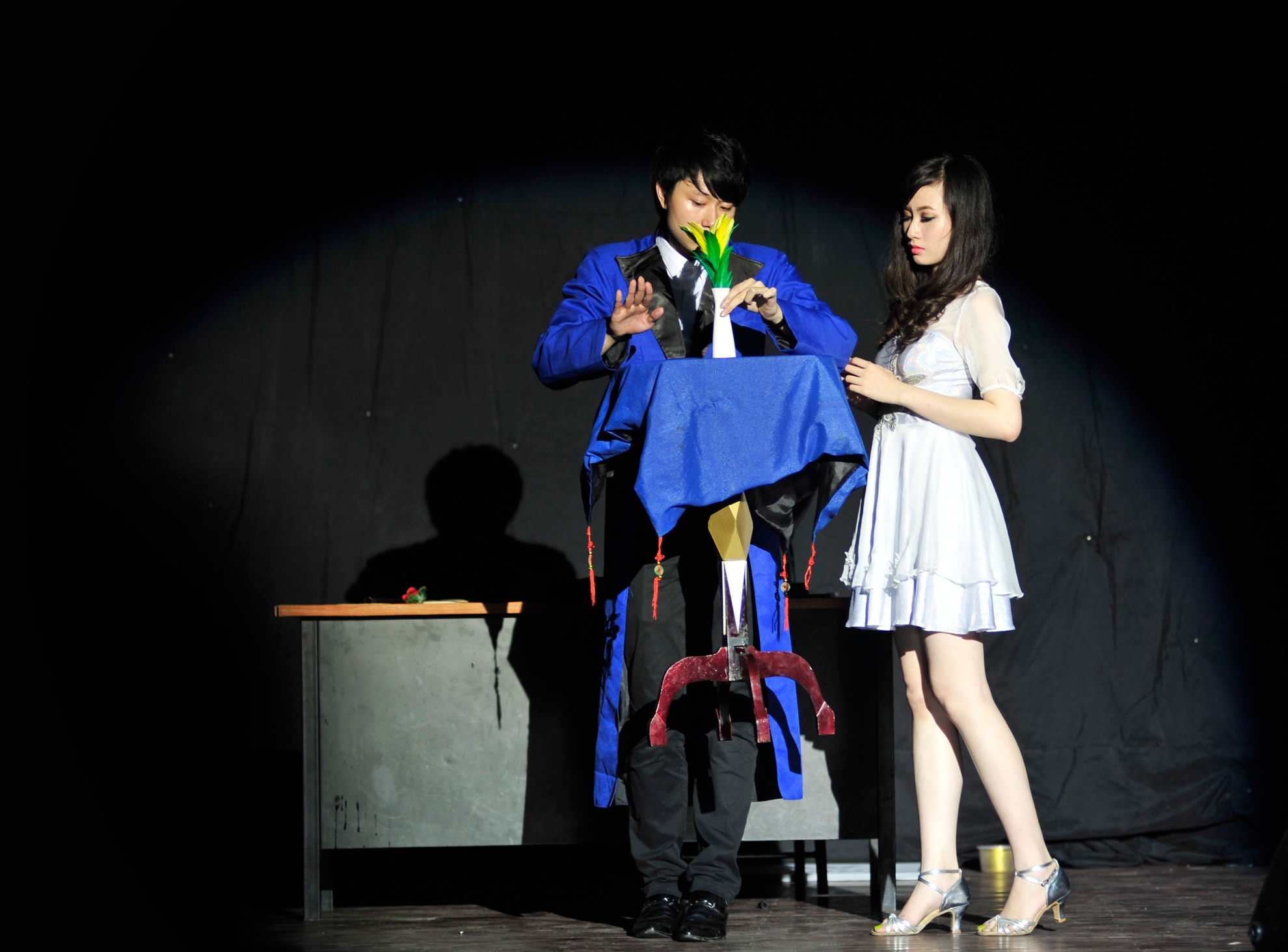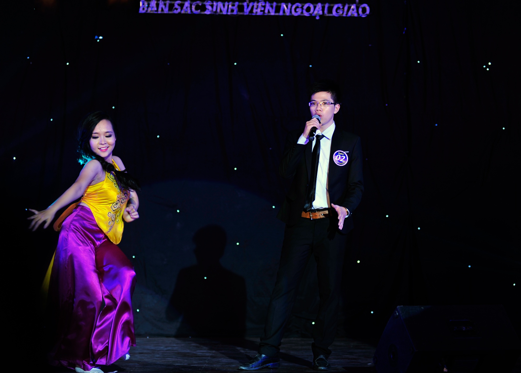 | Á quân Thanh Chung và bạn diễn Ngọc Huệ thể hiện tiết mục múa bóng "Hoa nở thời chiến" của tác giả Sơn Paris. |