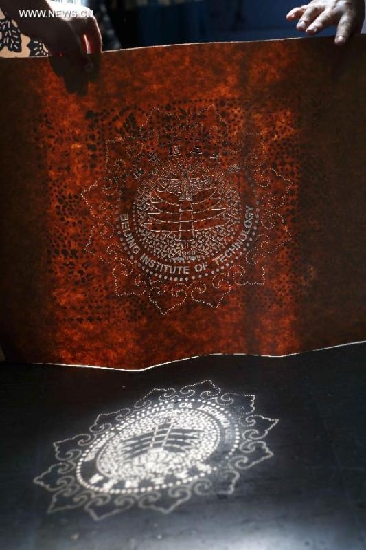| Một bản khắc họa bằng gỗ được dùng để tạo họa tiết trên vải trúc bâu do sinh viên Viện Công nghệ Bắc Kinh chế tạo. |