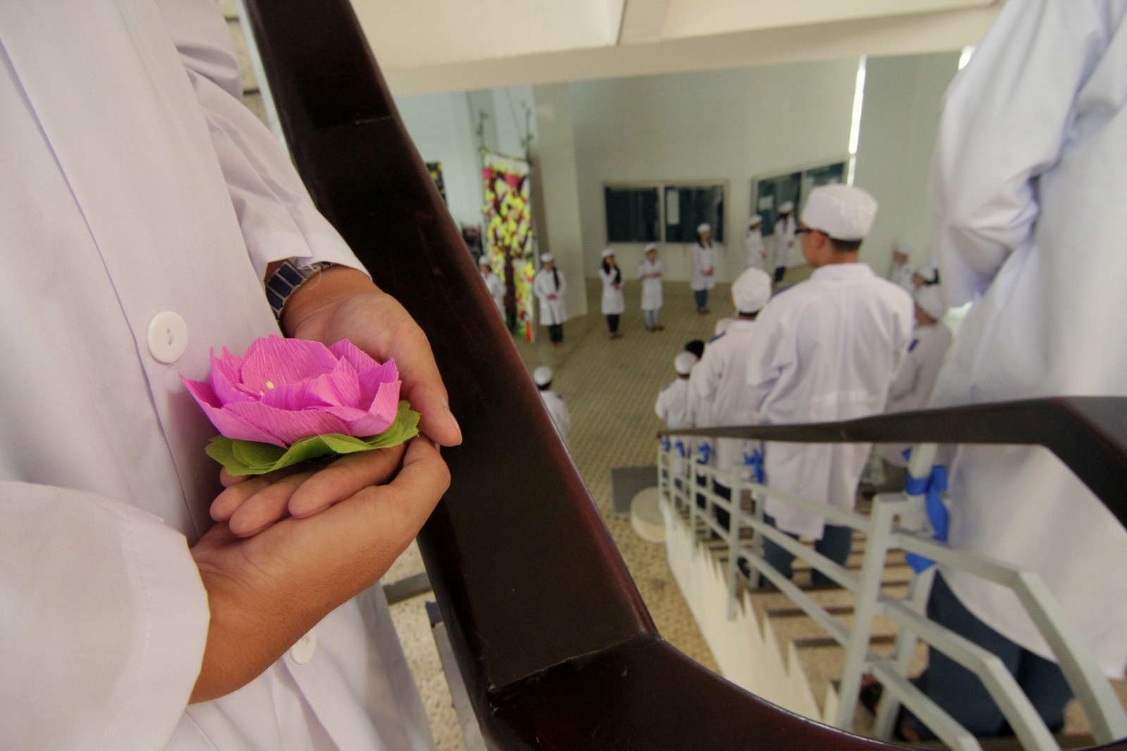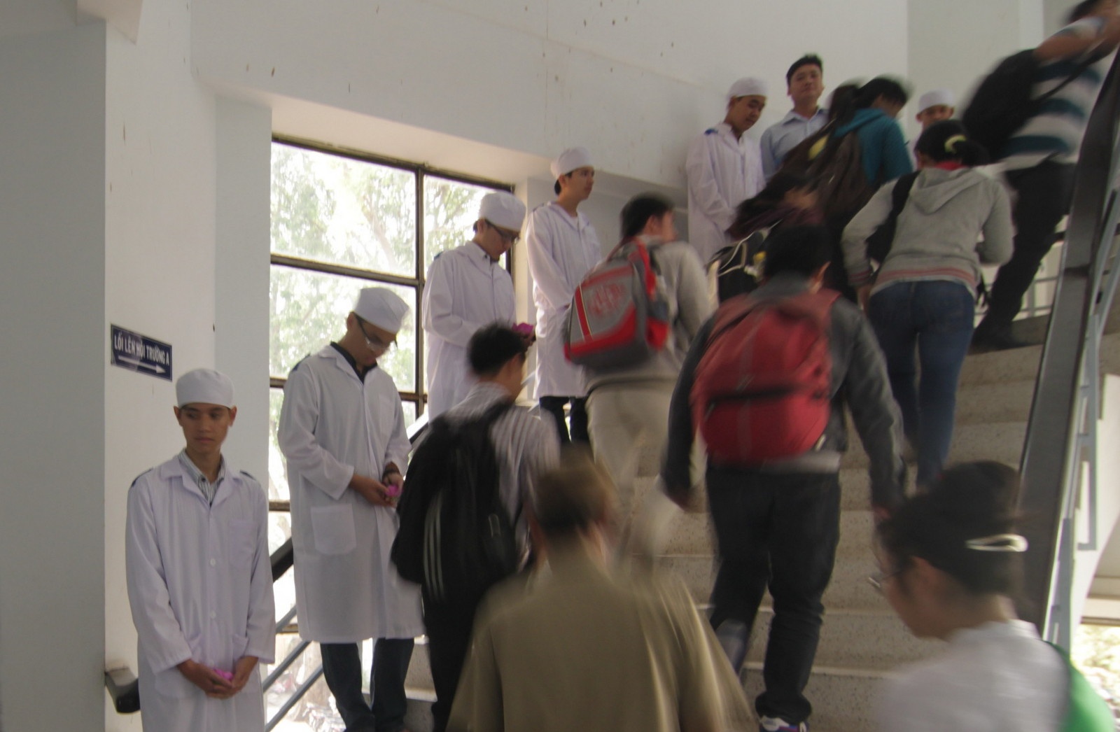 Sinh viên xếp thành hai hàng dọc các hành lang, cầu thang, sân trường để đón tiếp thân nhân của người hiến xác tới tham gia lễ tri ân.