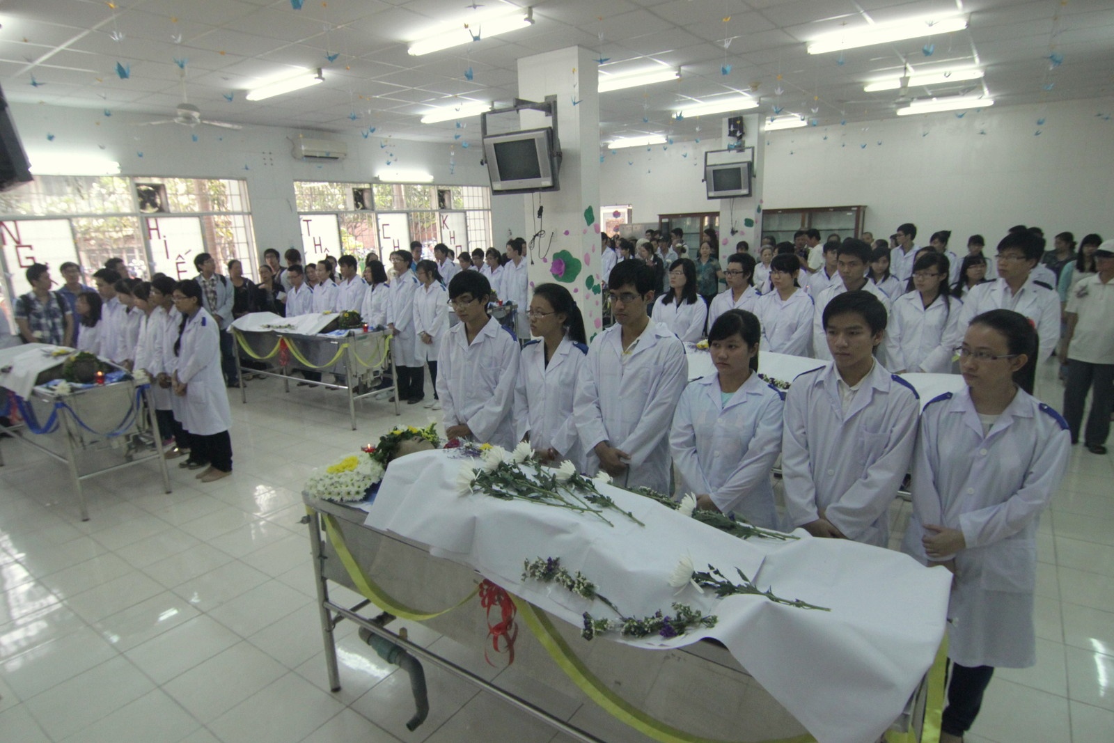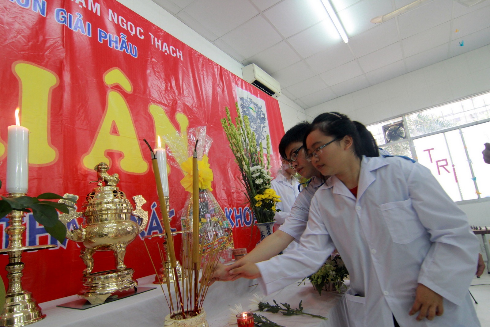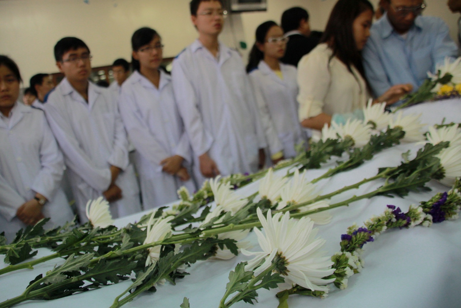 Ngay sau buổi lễ ở hội trường, các sinh viên tới phòng giải phẫu thắp hương. 17 trong số 4300 bộ thi hai của trường được phủ bạt trắng, xếp hoa cúc trong lễ tri ân.