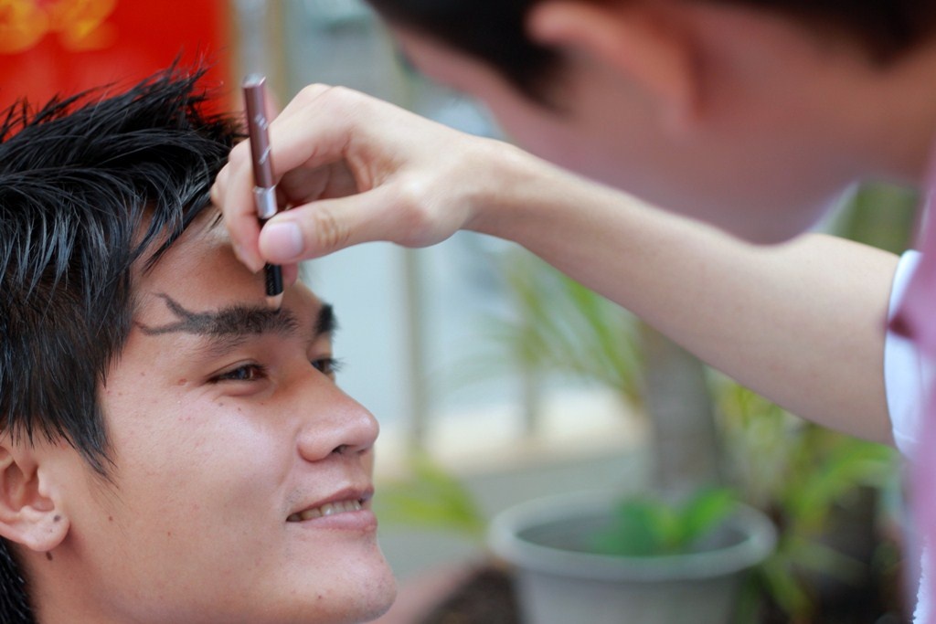 | Phanthavangsy (ĐH Kinh tế Luật, năm 4) nhờ bạn vẽ lên mặt để tạo không khí vui nhộn. Phanthavangsy cho biết: "Năm nào tại KTX Lào cũng tổ tức đón Tết Bunpimay. Có rất nhiều bạn Việt Nam đến chung vui với sinh viên ở đây". |