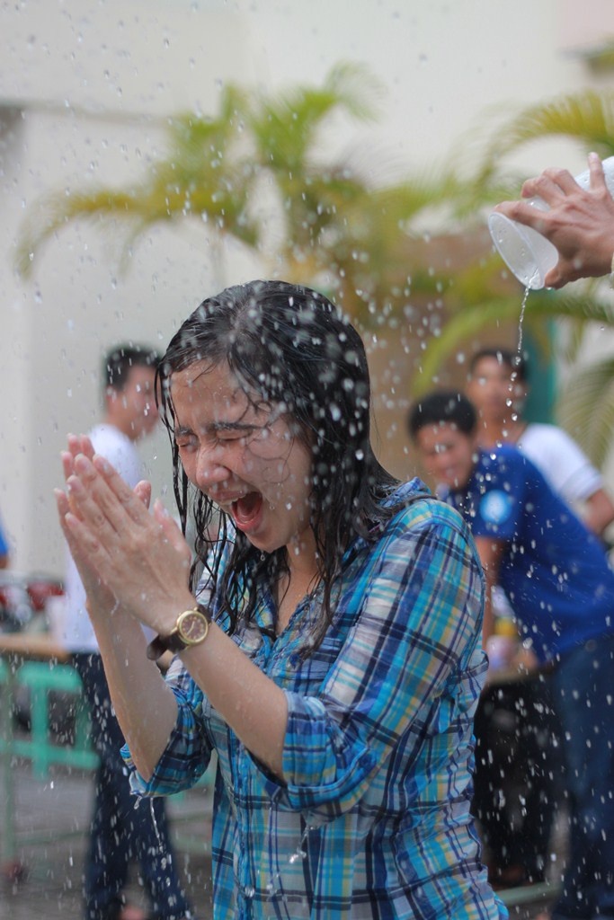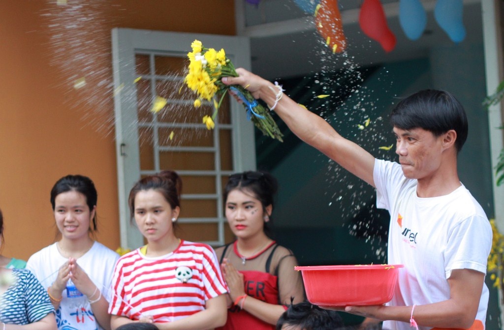 Những sinh viên Lào và Việt Nam tại KTX sinh viên Lào đã có một buổi chiều đón Tết Bunpimay. Các cô gái ướt sũng vì được té nước cầu may.