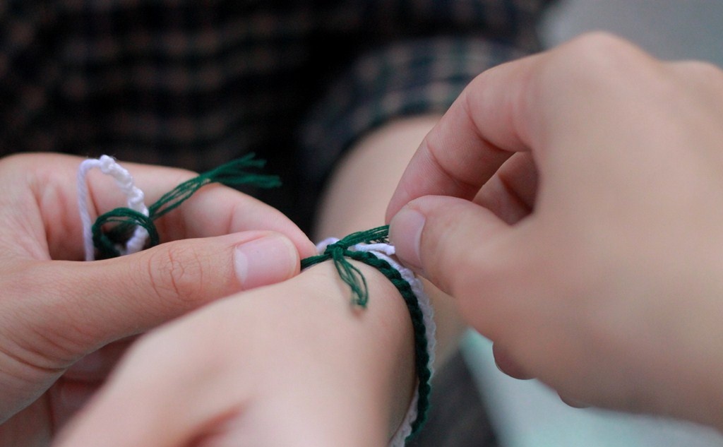 | Từng người tự buộc vào cổ tay người khác một vòng chỉ, biểu tượng hạnh phúc và sức khỏe. |