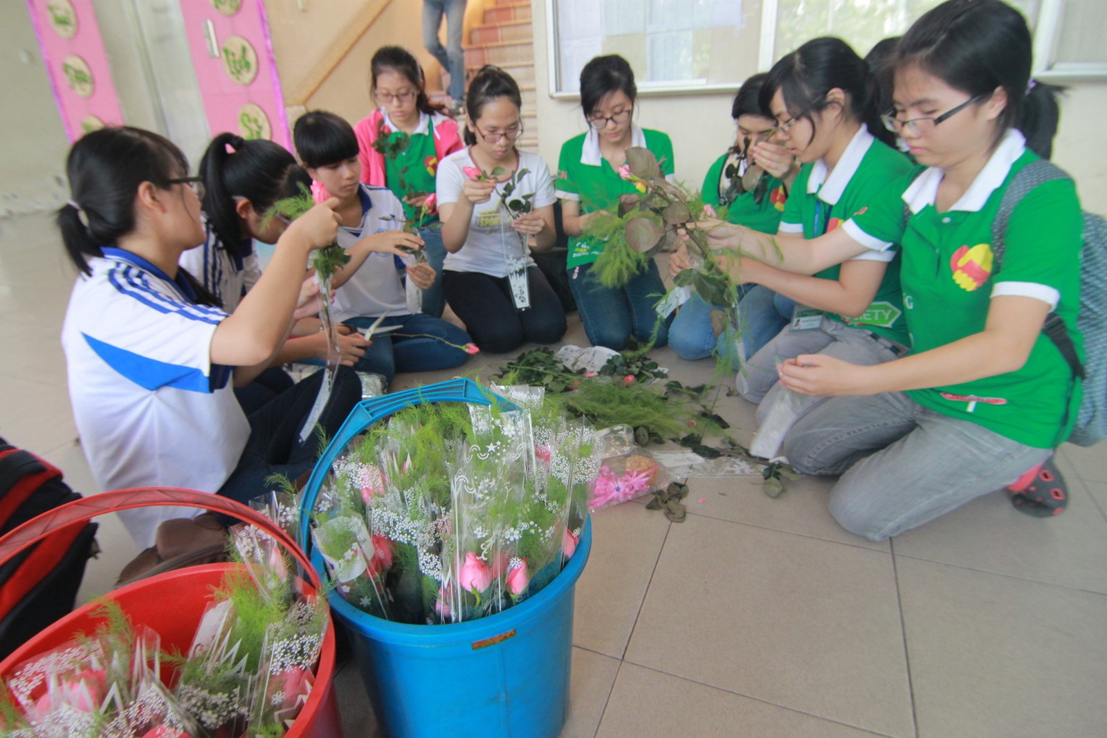 Nhóm sinh viên đội CTXH khoa Dược - ĐH Y dược TP.HCM đã làm sổ tay, bánh kẹo để bán lấy tiền mua hoa hồng, quà tặng cho những phụ nữ bị ung thư vú tại bệnh viện Ung Bướu TP.HCM.