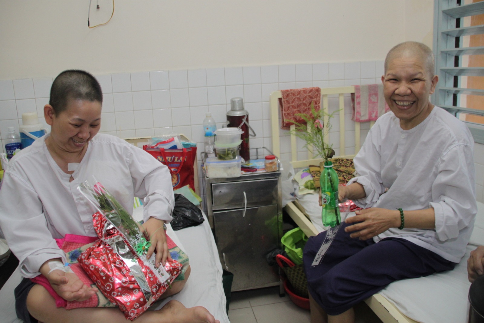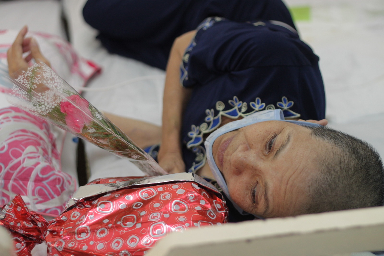 | Bà Nguyễn Thị Lệ (60 tuổi, quê Bình Thuận), mới lên điều trị được 2 tuần. Bà Lệ xúc động nói: "Tôi không có con cái, một thân một mình ở đây. Nay được mấy cháu hỏi thăm, tặng hoa nên cảm động lắm".