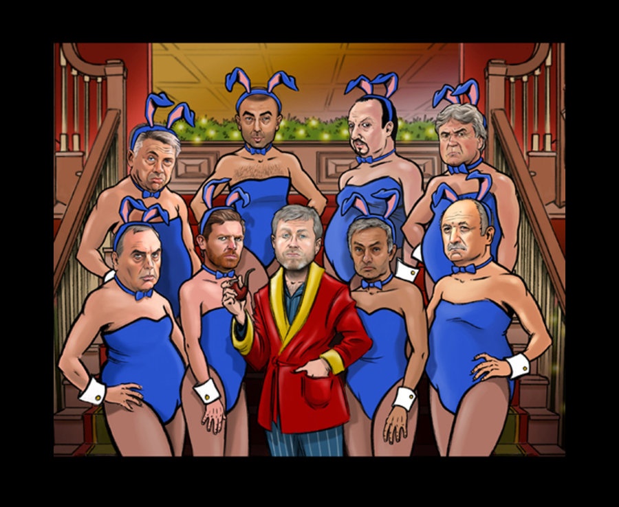 Chủ tịch Chelsea Roman Abramovich phởn phơ hóa thành "ông trùm chân dài" Playboy. Vây quanh Abramovich là đội quân đeo nơ gồm các HLV Chelsea từng bị ông sa thải: Ancelotti, Matteo, Benitez, Ancelotti, Hiddink, Avram Grant, Boas, Mourinho và Scolari. . |