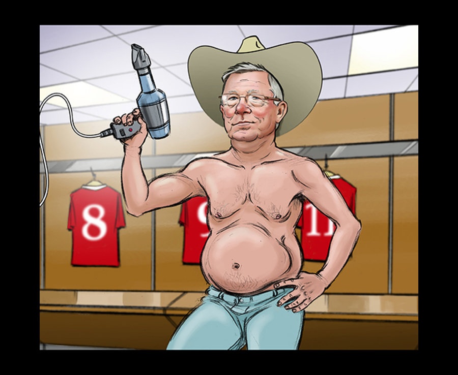"Máy sấy tóc" Sir Alex cởi trần khoe... bụng bia tròn xoe. Cựu HLV M.U cực ngầu trong chiếc mũ cao bồi và chiếc máy sấy vờ làm súng. |