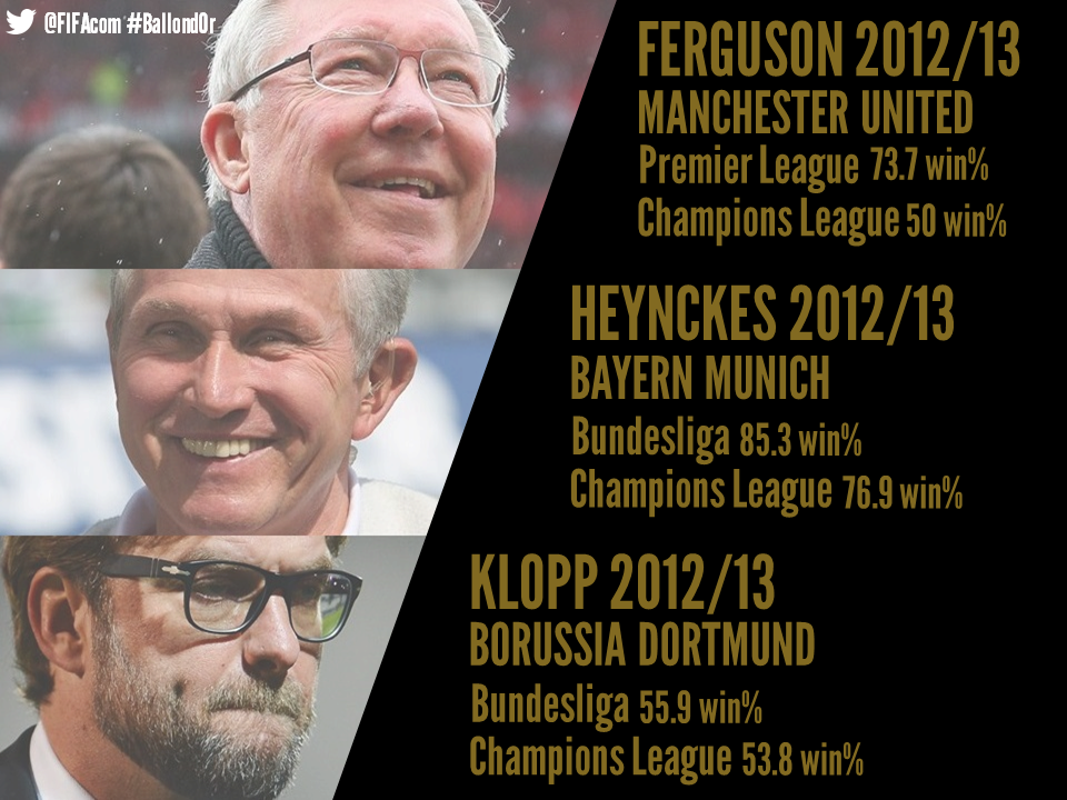 Dù đã giải nghệ mùa hè năm 2013, nhưng Sir Alex vẫn có tên trong danh sách đề cử HLV xuất sắc nhất năm cùng Juergen Klopp và Jupp Heynckes.