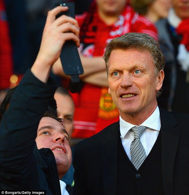 HLV David Moyes chụp ảnh "tự sướng" với một CĐV sau khi Quỷ đỏ kìm chân Hùm xám thành công.