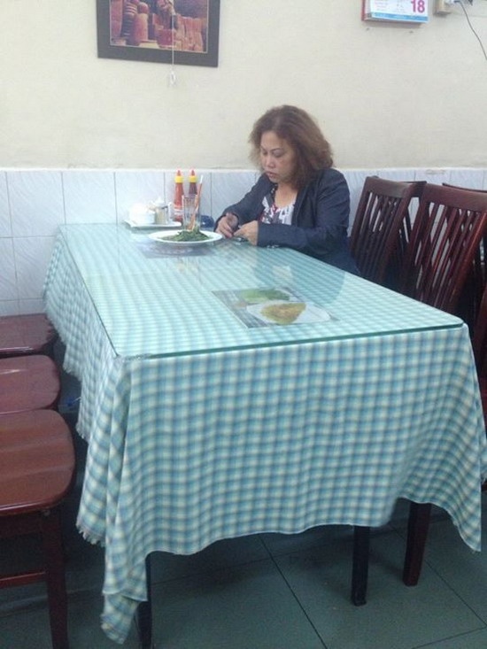 | Siu Black ngồi lặng lẽ trong quán ăn vắng vẻ. |