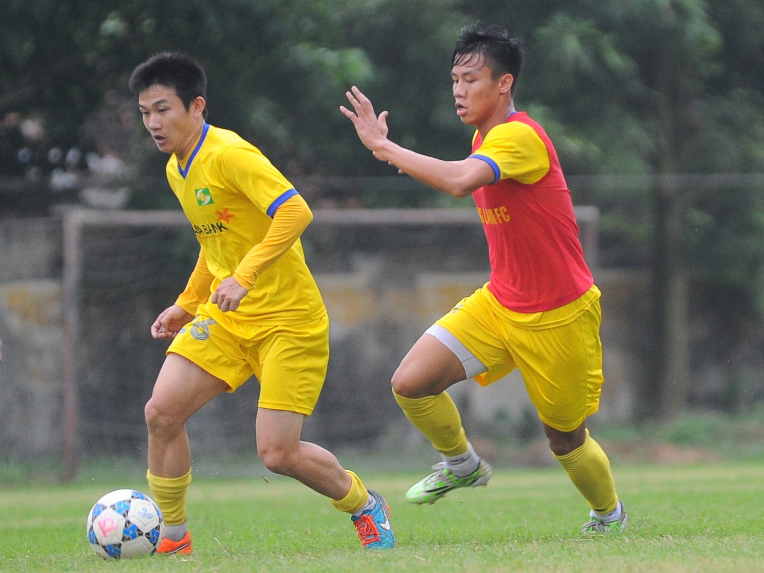 | Ngọc Hải (phải) được HLV Ngô Quang Trường đẩy lên đá vị trí tiền vệ trụ nhằm theo kèm Công Phượng. |