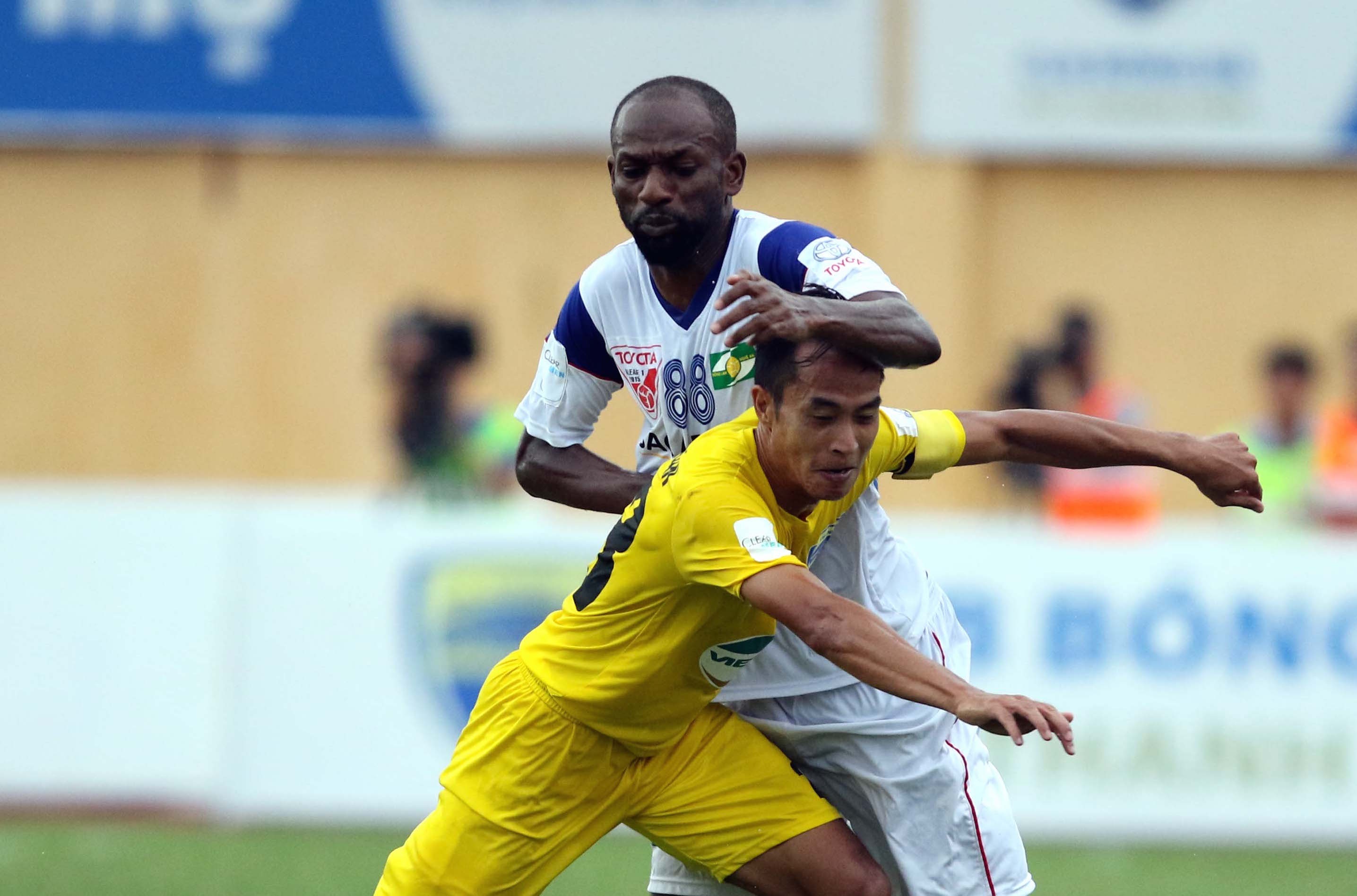 | Abdul Haruna (88) thi đấu thiếu "nhiệt" trong các pha tranh chấp với cầu thủ nội của Thanh Hóa. Ảnh: Minh Tuấn |