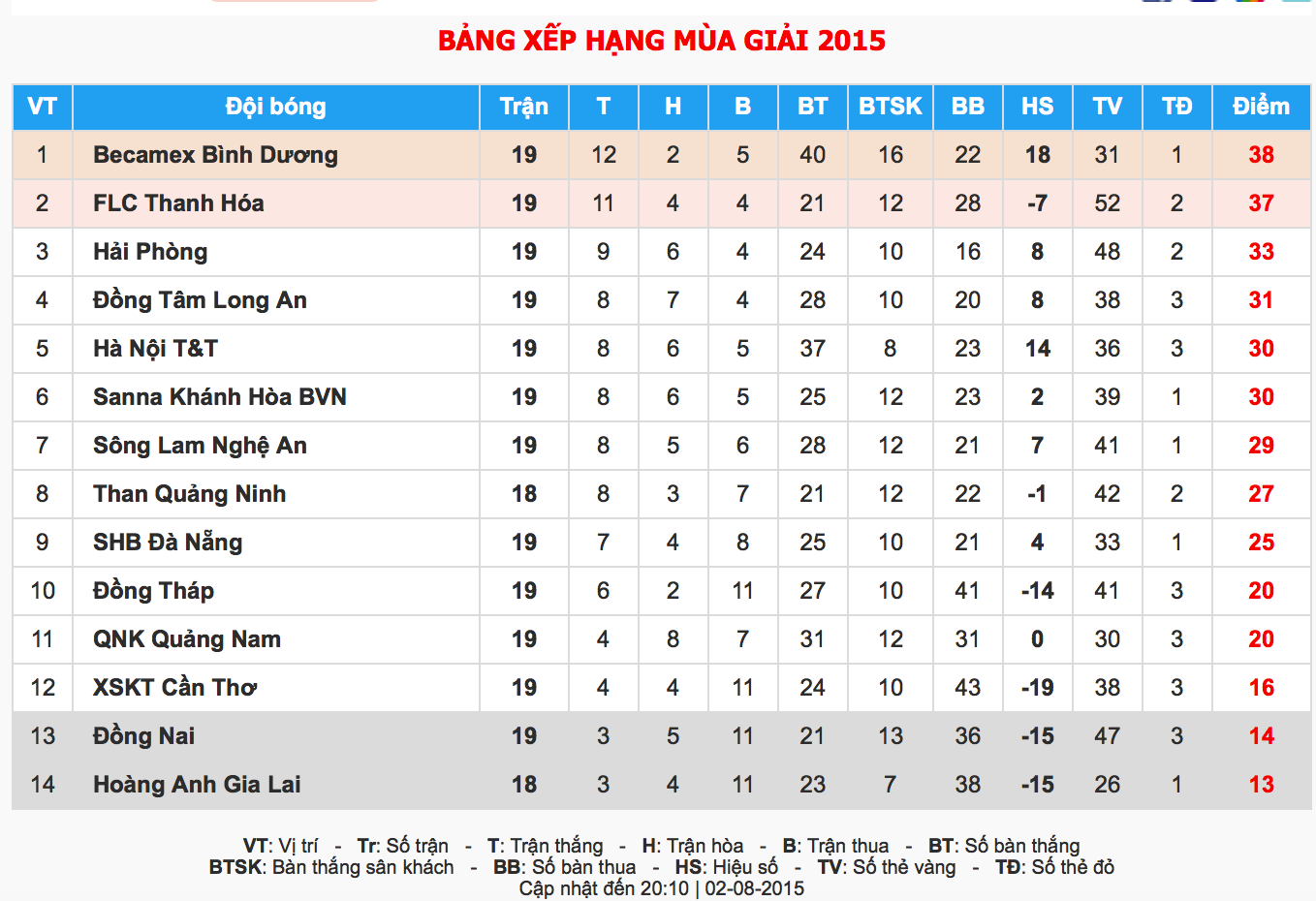 | Bảng xếp hạng V.League sau khi kết thúc 6 trận đấu trong khuôn khổ vòng 19 V.league 2015. |