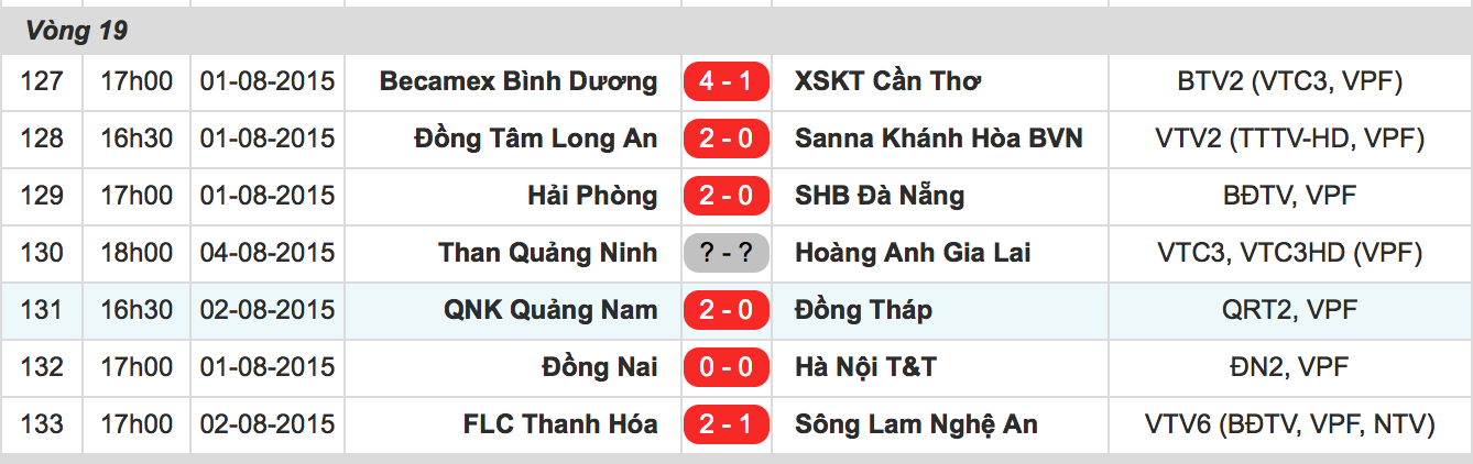 | Kết quả các trận đã diễn ra trong khuôn khổ vòng 19 V.League 2015. |