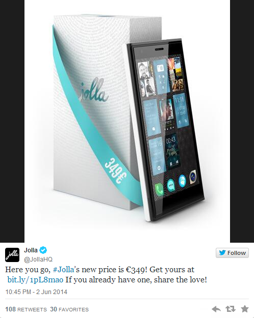 Jolla đang nỗ lực nhằm thu hút nhiều người dùng quan tâm đến các thiết bị chạy hệ điều hành Sailfish OS của hãng. Mới đây, trên tài khoản Twitter của mình, Jolla cho biết hãng sẽ giảm giá chiếc điện thoại tốt nhất của mình xuống còn 349 euro, ít hơn 50 euro so với giá bán ban đầu.