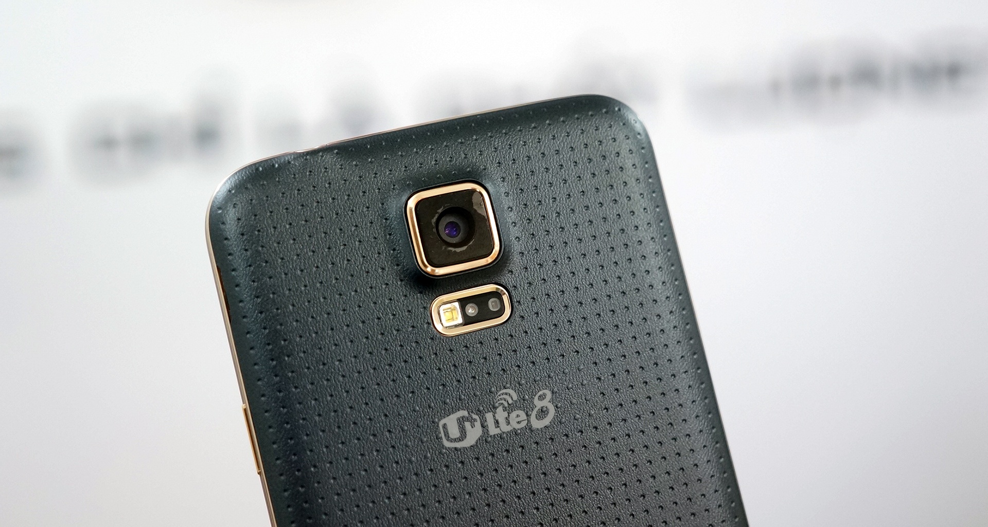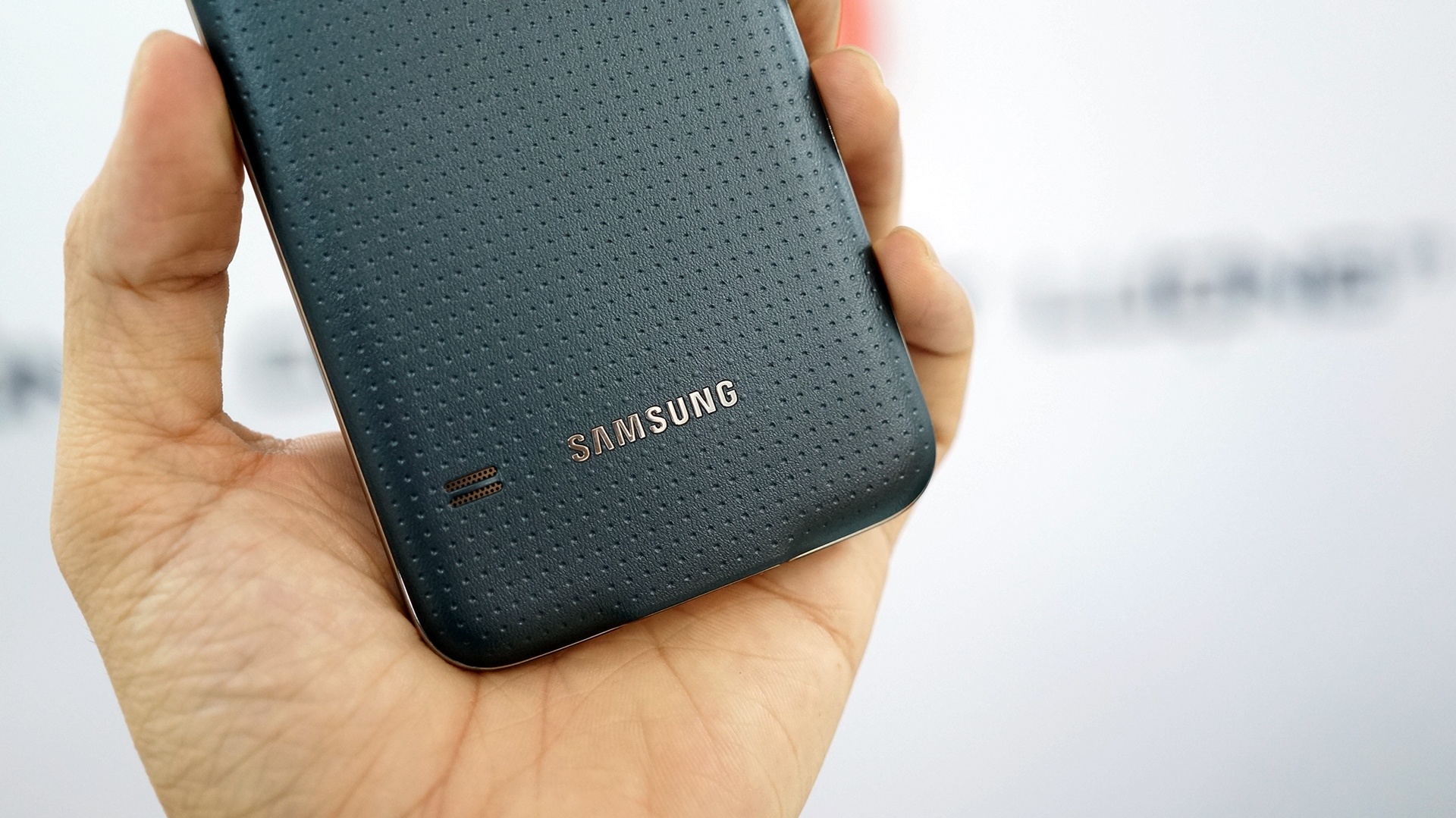 | Mặt sau là nắp nhựa nhiều lỗ nhỏ, logo LTE và Samsung. Cụm camera lồi và cảm biến vân tay tương tự Galaxy S5 thông thường. |