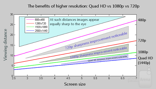 Về những nhận xét ở trên, để dễ hiểu hơn hãy đặt chúng trong điều kiện thật đơn giản: về mặt lý thuyết, bạn cần phải nhìn vào một màn hình 5,5 inch Quad HD từ khoảng cách 16 cm để mắt mình bắt đầu nhìn thấy rõ những điểm ảnh (với điều kiện bạn phải có thị lực 20/20, nếu không bạn sẽ cần nhìn gần hơn nữa). Còn ở cự ly bình thường, hầu như không ai có thể nhận thấy sự khác biệt về độ nét giữa một chiếc Galaxy S5 1.080p và một chiếc điện thoại Quad HD (LG G3).