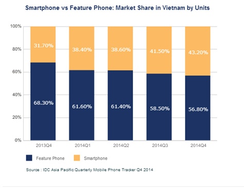Cũng theo IDC, đã có khoảng 28,7 triệu chiếc di động được bán ra tại Việt Nam trong năm 2014, trong đó 11,6 triệu chiếc là smartphone (chiếm tỷ lệ 41%). Trong năm qua, doanh số smartphone đã tăng 57%.