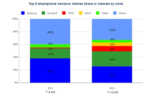 Mặc dù có một năm không thuận buồm xuôi gió khi chính thức chuyển giao bộ phận sản xuất di động cho Microsoft, Nokia vẫn tăng trưởng ngoạn mục tại Việt Nam. Theo báo cáo từ công ty nghiên cứu thị trường IDC, thị phần smartphone của Nokia đã tăng lên 24% trong năm 2014, từ mức 16% năm 2013. Trong khi đó, thị phần của Samsung sụt giảm mạnh, từ 38% xuống còn 26% trong 12 tháng qua.