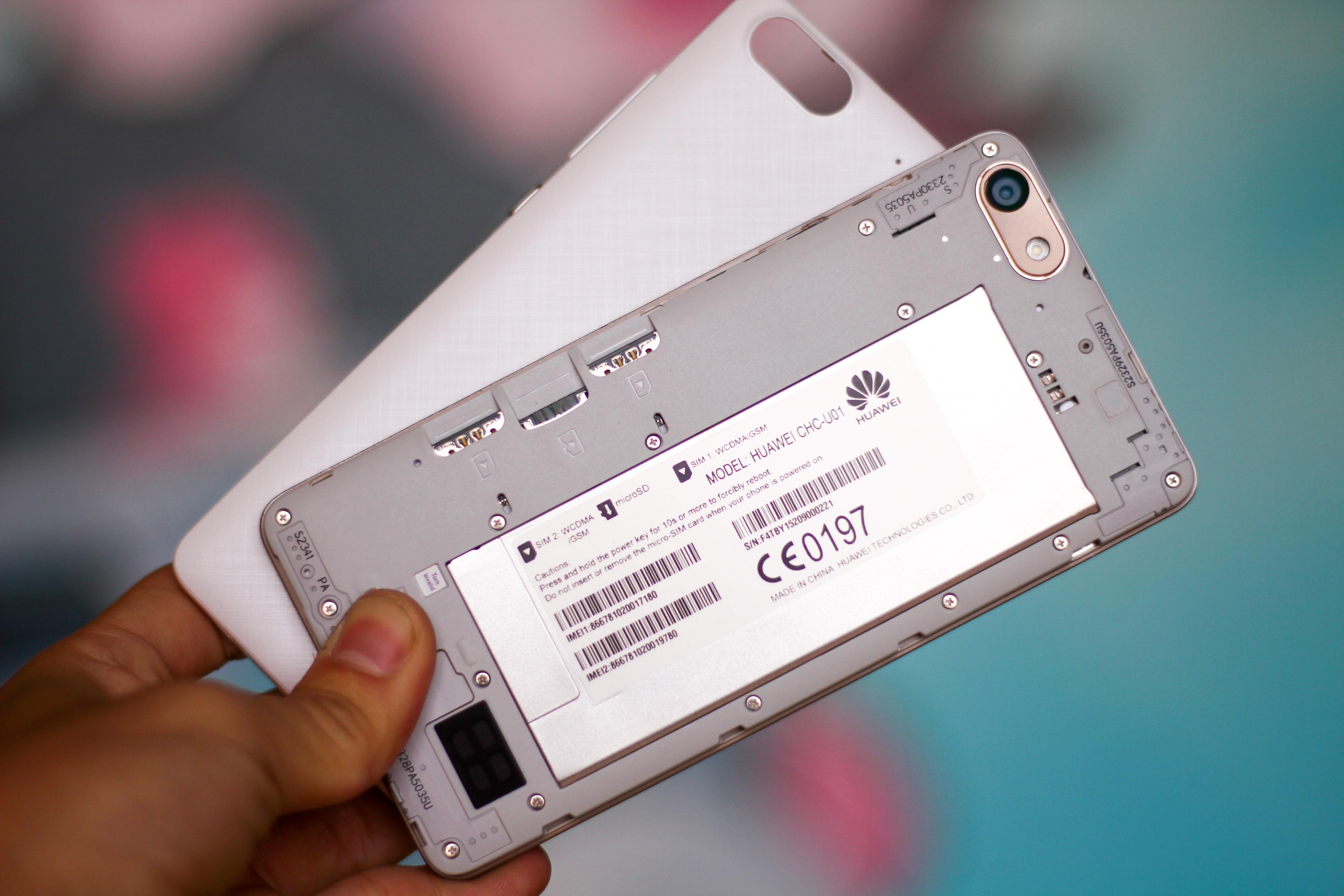 | Mặt lưng bằng nhựa xước và có thể tháo rời. Huawei G Play Mini hỗ trợ 2 SIM, pin 2.250 mAh. |
