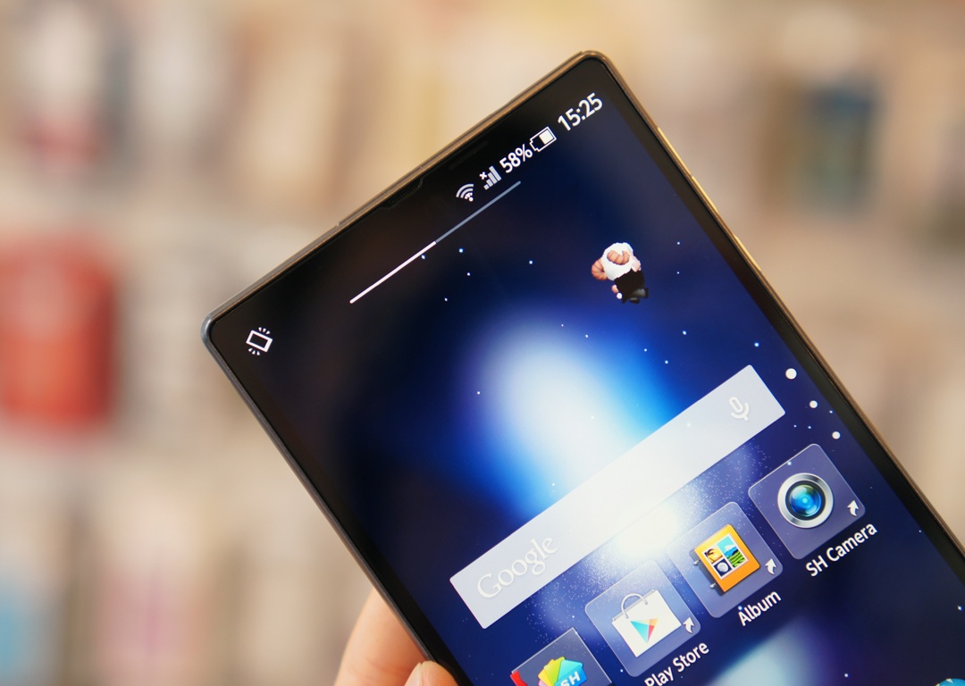 Ấn tượng đầu tiên khi cầm chiếc Sharp Aquos Zeta SH-04F chính là màn hình siêu nét của máy. Với viền cực mỏng, nội dung hiển thị của máy như tràn ra mép màn hình. Tỉ lệ bao phủ mặt trước của model này lên đến 81%.
