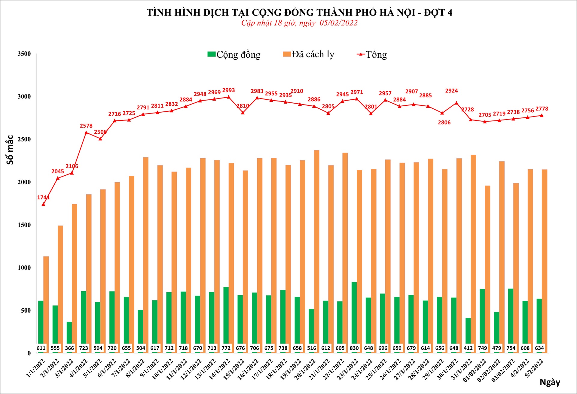 Ngày 5/2, Hà Nội ghi nhận thêm 2.778 trường hợp dương tính với SARS-CoV-2, nâng tổng số ca mắc của thành phố ở làn sóng dịch thứ 4 lên 148.385 người. Các trường hợp này được phát hiện trên toàn bộ 30/30 quận, huyện, thị xã thuộc Hà Nội.