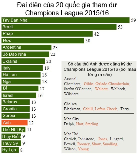 | Biểu đồ số cầu thủ đại diện cho các quốc gia tham dự Champions League mùa này. Đồ họa: Telegraph. |