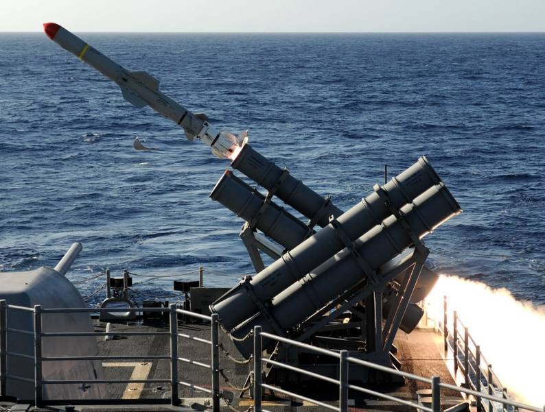 | Trong khi đó, tên lửa chống hạm chủ lực trên tàu chiến Mỹ là RGM-84 Harpoon. Đây là một tên lửa có tốc độ cận âm, tầm bắn khoảng 120 km. Nó được dẫn hướng đến mục tiêu bằng cách kết hợp giữa dẫn hướng quán tính và radar bán chủ động. |